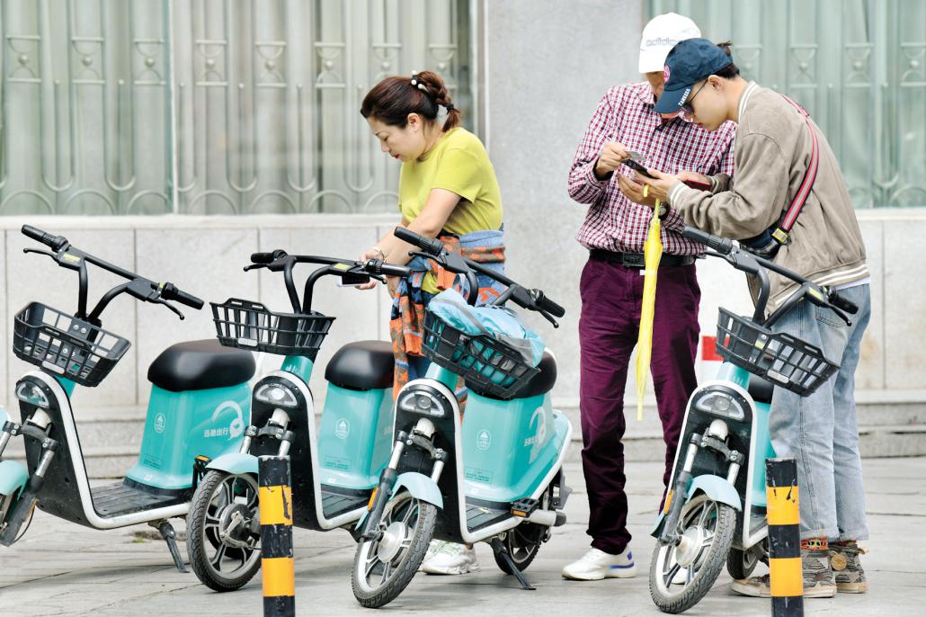 图为游客正在手机扫码共享电动单车。